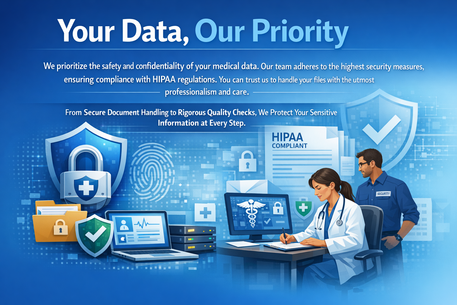 We prioritize the safety and confidentiality of your medical data. Our team adheres to the highest security measures, ensuring compliance with HIPAA regulations. You can trust us to handle your files with the utmost professionalism and care.